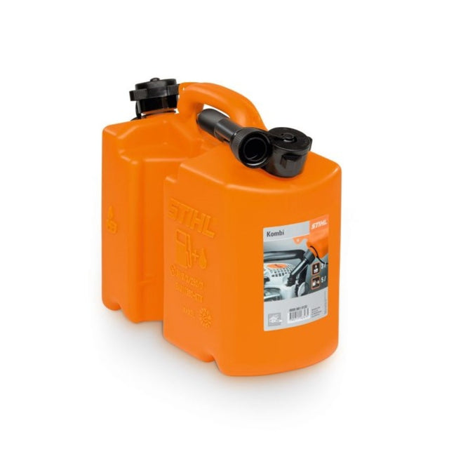 El bidón combinado STIHL es la solución práctica y segura para transportar combustible y aceite de cadena en un solo recipiente, ideal para usuarios de motosierras y otras herramientas a motor.